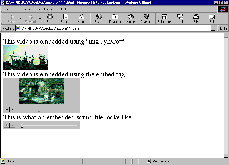 <img dynsrc= "video.avi" src= "alternative picture.gif"> for those viewing your site without Internet Explorer. Supposedly you can also include controls for your video by including the attribute "controls" but I cannot get it to work. And now for the Netscape way The Netscape way of embedding makes it possible also to embed sound files. It is very easy. This is the tag. <embed src= "video.avi"> <embed src= "sound.wav"> I recommend that you use this way if you are going to embed video because it will appear on both Internet Explorer and Netscape Navigator and the viewer will have controls. It is not however as visually attractive. Explorer View 11.1 - click on the