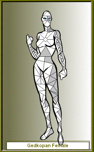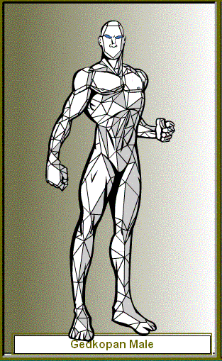 The Gedkopan are a bizarre (by Earth standards) diviation in the processes of evolution, they have evolved not from animal but mineral. Gedkopans are living ore who at will may take human form. In their natural state, they appear as intricately cut diamond, black onyx or ruby quartz about the size of a human fist.