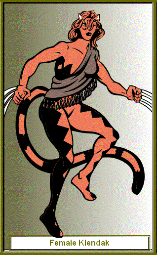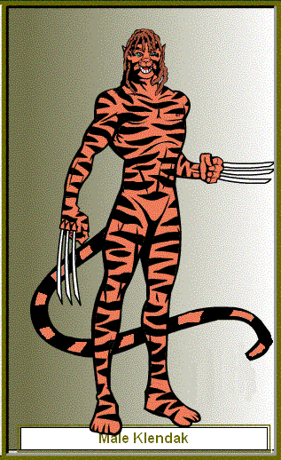 The Klendak resemble cats. They are sleak and slinder beings with long tails and pointed ears. A Klendak will live to about the age of 90 Earth years, but, as slaves usually don't see their 35th birthday. The Klendak stand at about 5'5" for males (1.67) and 5' for females (1.83). Those born into slavery have a 6 digit number tattooed on each wrist and on the back of the neck; Free-borns do not.