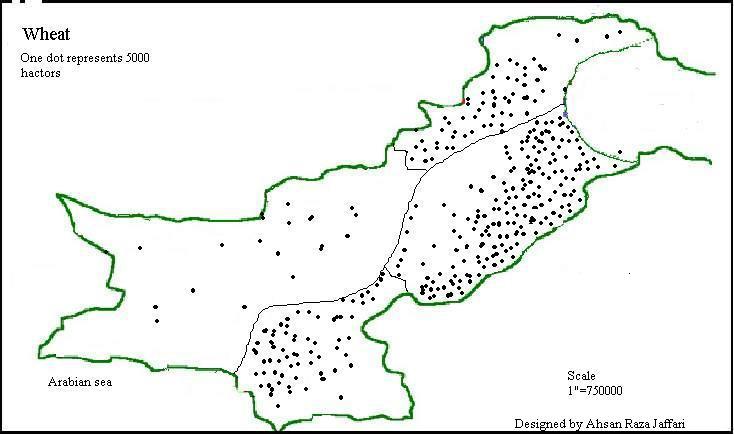 The following map shows the production of wheat in Pakistan per hactors. The map shows that Punjab produces almost 50% of wheat of Pakistan.