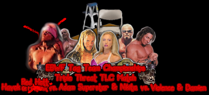 JR- - This match is a Ladder Match three way tag match for the EBWF tag titles titles. On there way to the ring at this time, Havok & Redhott!!! "Cowboys from Hell" Hit as the two men walk out.