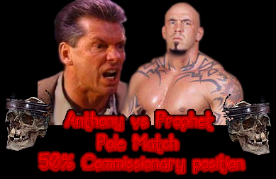 JR-“Ladies and gentlemen, ever since the revelation of the mystery man, who took the EBWF by storm, there has been trouble brewing in our commissioners office. Commissioner MacDonald has been consumed by a bitter hate for the Prophet after many altercations and it all come down to tonight. Two poles…two contracts, each devised by either man and all they need is a signature to validate them. Prophets fate in the EBWF hangs in the balance…let’s take it to the ring.”