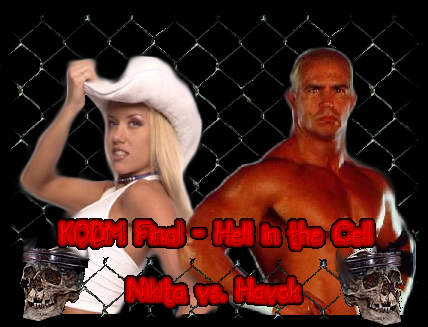 Havok is struggling to his feet as Nikits is laying boots to the back of Havok's head. Havok catches one of her feet and rotate's his body sending Nikita's body up and over Havok's body and her face meeting squarely with one of the renforcement poles for the cell. Nikita stummbles backward with blood trickling from her nose as Havok rises to her feet and slams her to the concerte with a Cobra clutch Plex. Nikita lands squarely on her head and just lays there. Havok begins scaleing the wire mesh of the cell and jumps onto Nikita with an elbow drop. Both Havok and Nikita are laying on the gorund sucking wind trying to get up. Havok has blood pouring in buckets from his head and Nikita has blood trickling from her nose. Havok manages to get to his feet first and pulls Nikita up by her hair. he grabs Nikita by the face and begins grinding her face against the mesh ripping and tearing her skin. Havok pulls her backwards and slams her to the mat. Nikita is bleeding reguarly with many lascerations from her face. Havok picks her back up and slides her in the ring as he is grabbing a chair. Havok slides in after Nikita as she is getting to her feet. Havok goes to swing the chair as Nikita crescent kicks it back into his head. It bounces off Havok;s head with a sickening thud as he falls to the mat. He lays on the mat in pain trying despertely to keep the blood out of his eye's as Nikita climbs the turnbuckle.