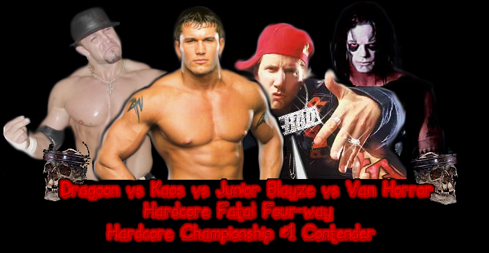 Ratfinks, Suicide Tanks, Cannibal Girls by White Zombie begins and the demeanted Van Horror comes out to the darkened arena only blue strobe lights flash casting a evil shadow. Van climbs into the ring and sits in the corner waiting for his victims. X gonna give it to ya by DMX blasts and Dragoon struts out and crowd reacts in mixed emotion. He eyes Van Horror in the corner of the ring as he enters. Then his music is replaced by Break Stuff by Limp Bizkit. Kaos spins on the ramp showing that winning smile to make the girls swoon and his Wildarms title. He points to the two in ring then makes a cut throat motion saying that he will win. Before he makes it to the ring In da club blares and Junior Blayze runs behind Kaos and begins his assault. Dragoon and Van Horror exchange punches as the bell sounds. Kaos is beating the hell out of Junior as Dragoon gets tossed to the outside thanks to Van Horror. Kaos then turns attention to Van Horror. He rolls into the ring and the two men circle each other. Dragoon gets up and sees Junior. He stalks towards him, but Junior screams like a women and takes off running around the ring. Dragoon starts to chase him, but instead plays a trick. Junior keeps running around the ring looking behind him nervously when he looks back in front of him he gets a clothesline from Dragoon which sents him to the floor. Dragoon smirks as he picks up the small man. Dragoon tosses Junior inside and quickly Kaos and Van Horror stomp the man. Dragoon surprisingly comes to Junior's aid and pulls the vultures off. Kaos doesn't like this move so he shoves Dragoon into the ropes waiting for him to bounce back, but Dragoon holds firmly to the ropes. Kaos starts towards him, but is cut off by a dropkick from Van. Kaos ignores Van for the moment and goes after Dragoon. It looks like a battle dome instead of a wrestling ring. Kaos is taking it to Dragoon, but quickly the tables turn and Dragoon has the upper hand. Then Van Horror gets into the middle of the fight, but both Dragoon and Kaos shove him back. Kaos gets Dragoon in the Kaos Krunch and Dragoon is spent so he turns his attention to Van. Kaos and Van go back and forth for a couple of minutes then Kaos hits him with a hard right and Van is thrown backwards then Kaos capitalizes on this by pulling off The Rush. Van is out now it's just Kaos and Junior. Junior is leaning in the corner trying to regain his senses, but Kaos has no time for this. He pulls Junior on his feet beating his head into the turnbuckle until a familar voice booms and stops the action Kaos turns to see Fallen Angel with his smirk stretched across his face he draws a blood red cross on the mat. Kaos drops Junior and tries to baseball slides at Chris Daniels, but he moves out of the way and Kaos is yelling profanity as Junior rolls Dragoon up for the pin. 1....2...3! Junior jumps up and down as Daniels waves sarcasticly at Kaos. Junior scrabbles out of the ring as Kaos runs to the ropes filled with rage.