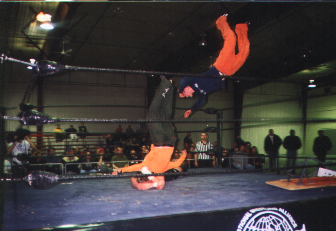 A moonsault (backflip) to the floor, onto some poor joe, from the top turnbuckle...U of M gym...