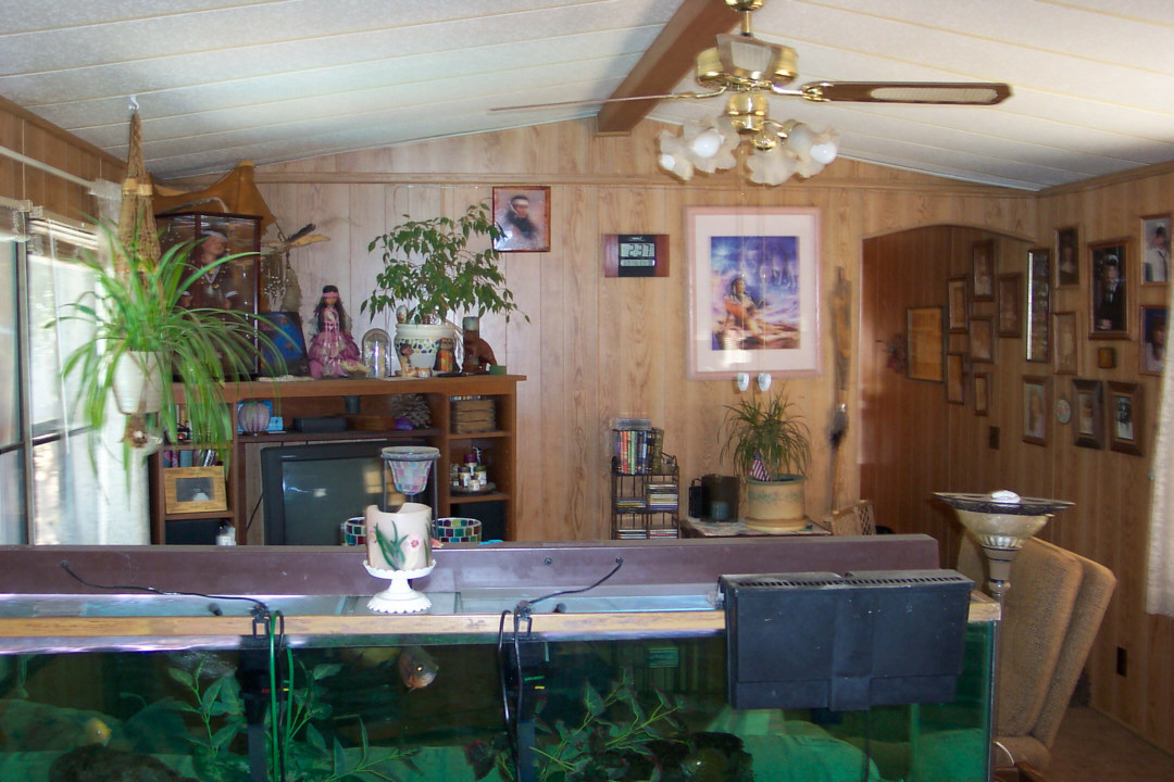 - Interior of Becci's trailer. Look at the humongous aquarium! The two large fishes in the middle are oscars.