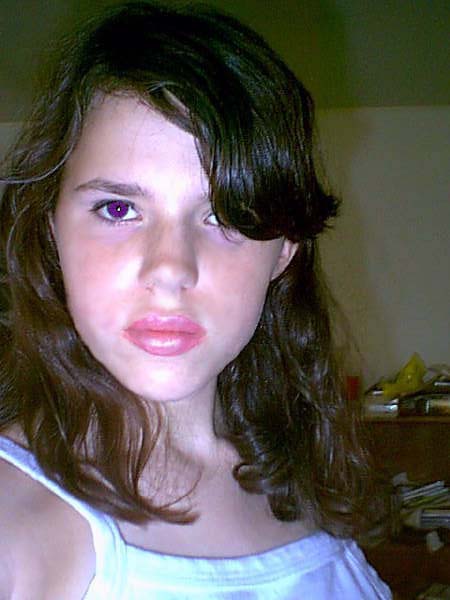 Ok This picture is about the same as the one above only this one was retouched in photoshop. As you can see I got rid of those gosh darn blemishes and colored my eyes purple ^^