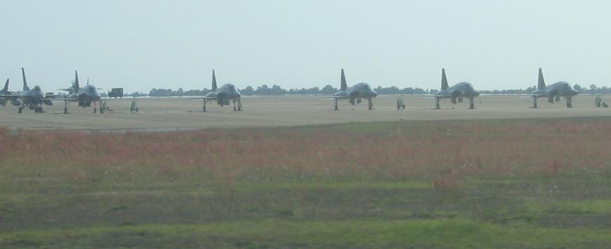 This is 5 F-5 Tigers stopping to refuel at Eglin next to an F-16, far left. The F-5's are the same aircraft used in Top Gun as the enemy MiGs.