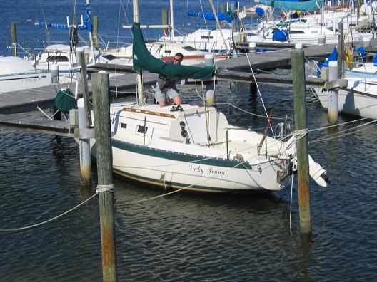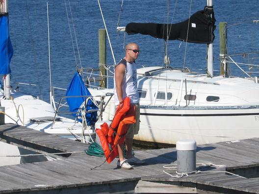 Tom tieing up the main sail after a day of taking one of the boats out on base.