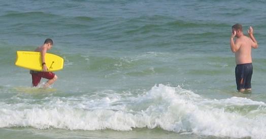 Ryan trying to teach some kid to boogie board, its the teacher instinct in him coming out.
