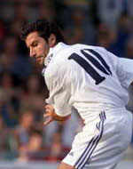 After the UEFA European Championship 2000, Figo made the courageous decision to move from Barcelona to Real Madrid for the incredible sum of £37m, then a world record transfer. World Footballer of the Year in 2001, and after a couple of relatively poor seasons by his standards, Figo has returned to top-notch. He always does the same little shimmy, the same little swerve to the right without the ball - but he does it so well that his opponents fall for it every time. Far from losing his place with the arrival of Beckham, he seems to have become one of his only real mates, and has benefited from the Englishman's ability to get the ball out to him quickly and efficiently. Many say he's on his way, but I see no reason whatsoever why Madrid should wish to sever their links with him, grumpy and difficult though he can undoubtedly be.