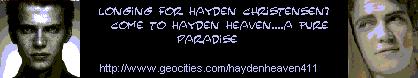 Check it Out!:I am no longer updating NEWS, because it takes up too much of my time, AND you can receive a more complete, up to date DAILY dosage of HAYDEN delivered right to your inbox by going to www.Google.com , and clicking on the NEWS tab. There will be a "NEWS ALERTS" LINK on the left side of the page. ADD Hayden Christensen to this alert, or make a list of 'em!