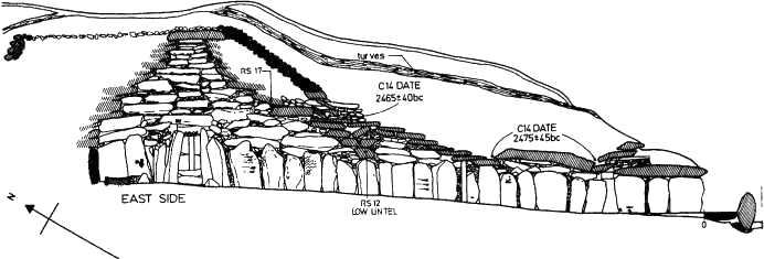 Since the monument stands on a ridge and the ground beneath falls away to the North and South, the rain-water quickly runs down through the loose body of the cairn and when it meets the iron-pan-indurated surfaces of the layers of turves, or the pan-coated old turf surface beneath, the natural flow is to the North and South.Because water corrupts the dating-sample material by leaching-out the radiocarbon from the sample, making it appear much older than it really is, the radiocarbon dating of these two sets of samples is bound to give a reading much older than the real date. These readings therefore have to be discounted as a means of dating the cairn and other evidence, by which it can be dated, must be found.