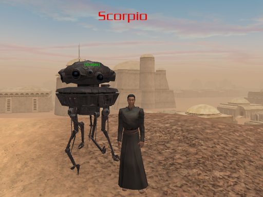 A few days ago I meet a gorgeous Droid Engineer Lady in Naboo. Since I was looking to buy a combat droid I asked her if she could build one for me. She said yes and in no time I had my first combat droid. I named him Scorpio. He was a little disobedient at first but he learned who is the boss. Now we are partners of adventure. Thats a pic of my latest journey to Luke Skywalker home planet, Tatooine. |