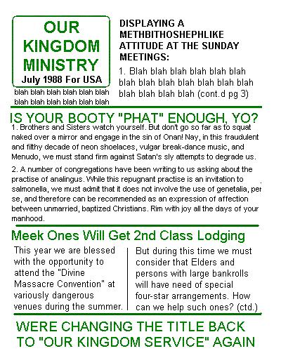 Rare example of the Kindom Ministry, shortly before its name changed back to Kingdom Service. Subsequently the policy was made to change the title of this publication with every change of Italian government as a test to prove whether anyone ever really read it or not. Astonishingly it was discovered long-time witnesses simply kept a copy of every color an recycled them at Service Meetings, pretending to follow along to a meeting conductor who was typcally winging it with a carefully folded paper towel from the men's room.