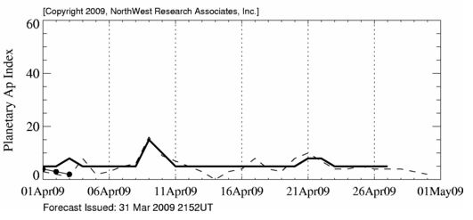 THE AP FORECAST (http://www.swpc.noaa.gov/ftpdir/latest/45DF.txt) IS ALSO A KP FORECAST THAT CROSS MATCHES WITH NORTHWEST RESEARCH SPACE ASSOCIATES