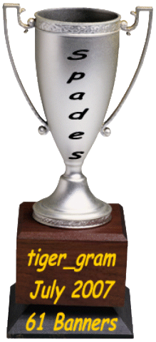 July was a "Banner Month" for The Tigers! 180 banners were collected in Spades for the month - reflective of the old days in the Zone. tiger_gram once again dominated with 61 banners to her credit. Tiger_Gal37_DA was pushing her with 44 banners won for Spades Runner Up Honors. Tiger_BlossomDA posted 22 banners in July and Tiger_Doctor_DA hit the double digits with 15 earned. Tiger_KingLions turned in 11 this month.