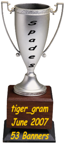 A new Tiger, Tiger_Kinglions from Italy earned the Spades Runner Up Award with 9 banners posted. Kinglions is a recruit of tiger_gram's and we welcome him to the Tigers and he is off and running. A very pleasant chap, he is honing his English skills - please make him feel at home and you can find him in the tourney rooms at the Peak.