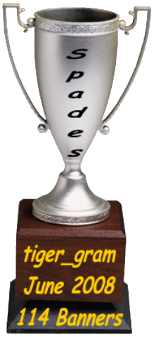 Runner-up honors go to Tiger_Gabby__DA for the second consecutive month with 22 banners posted in Spades. Tiger_Casanova was nipping at her heels with 15 banners won. Gabby aslo retained her title as top pegger by posting the most Cribbage banners. Tiger_Patti_DA with her pard, _B@B_Zoora_, captured runners up honors in the True Spaders TOC on June 28th.