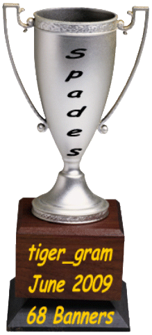 A total of 268 Spades banners were posted during the month by 14 Tigers! tiger_gram retained her Spades Cup for June with 68 banners to her credit. Nipping at her heels was Tiger_Gabby__DA, runner up with 64 banners claimed. Tiger_Kinglions was third posting 58 banners. Honorable mention goes to Tiger_Hazmac0 with 28 banners and Tiger_Mike with 19 banners.