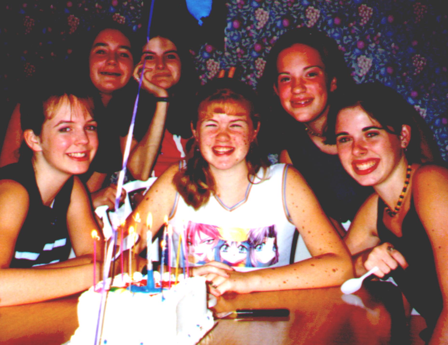 This is on my 13th birthday. We are just about to go play Lazer Tag! L to R (Cynthia, Sara, Angie, Me, Lauren, Meredith)