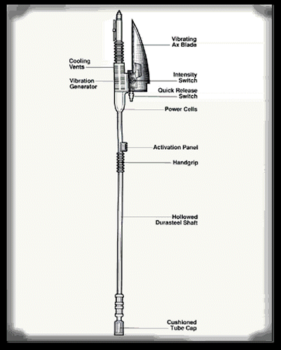 ![]() Lando Calrissian went undercover as a guard in the palace of Jabba the Hutt, waiting in disguise for the right moment to rescue Han Solo. His weapon is a form of vibro-ax, a SoroSuub BD-1 Cutter. In such weapons an ultrasonic vibration generator makes the blade sing with a high-pitched whine, enabling it to lacerate with the merest touch. |