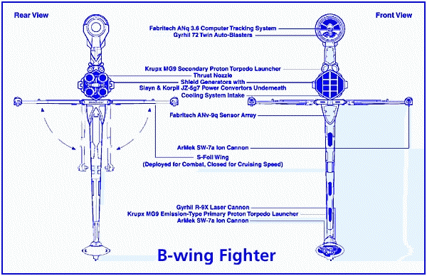 ![]() A spacecraft personally designed by Admiral Ackbar, the B-wing fighter plays a major role in the Rebel Alliance fleet at the Battle of Endor. One of the Alliance's most heavily-armed starfighters, the B-wing, in effect, is one long, flat wing with an unusual rotating cockpit at one end, and one of the ship's three ion cannons at the other. About midway on the wing are two airfoils that extend out during combat, giving the ship the appearance of a cross. Because of its unusual gyro-stabilization system, the cockpit remains steady while the rest of the ship rotates around it, giving the pilot a stable field of fire. Designed to go head-to-head with much larger Imperial ships and disable them, the B-wing is also used for heavy assault strikes against Imperial facilities and as an escort for X-wing and Y-wing fighters. In addition to the ion cannons, there is a laser cannon mounted below the cockpit, two proton torpedo launchers and two small blaster cannons. An enhanced model, such as the one Ackbar has used personally, has an expanded command module that accommodates a gunner. This and other design revisions have made the ship faster and tougher, and have substantially increased its combat success rate. |