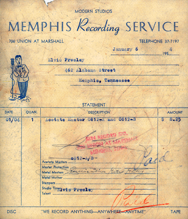 Perhaps, they tried other material that night, tried working up other songs in the same vein as "That's All Right." They may have done "Tiger Man," a song Sam had cowritten (under the name Burns) with blues artist Joe Hill Louis and given to Rufus Thomas to record. (We know that in 1970 Elvis kicked off the song with a cryptic introduction: "This was my second record, but not too many people got to hear it.") It may have been before "I Love You Because" that they spent time on "Harbor Lights," but they couldn't get the Hawaiian-inspired pop song right. Eventually, though, they came up with a song even more improbable than "That's All Right"–and just as promising. From a childhood of Saturday nights listening to the Grand Ole Opry, Elvis knew the bluegrass music of Bill Monroe and his Bluegrass Boys. The waltz tempo of "Blue Moon Of Kentucky" was as far from Crudup's rhythm and blues as you could get, but the group straightened the song out, converted it to 4/4 time, and brought the tempo up to that of the earlier number. After an early take Sam enthused, "Fine, man. Hell, that's different. That's a pop song now, nearly 'bout." With a few more takes and a little more refinement, the song edged even further from its country roots and into the domain of rhythm and blues. The result was something compatible with "That's All Right," and, more important, the perfect B-side to a record.