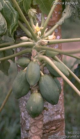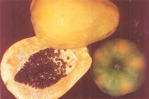 Common Names: Papaya, Papaw or Paw Paw (Australia), Mamao (Brazil), Tree Melon. Other names: Chich Put, Fan Kua, Kavunagaci, Lechoso, Lohong Si Phle, Mapaza, Mu Kua, Papailler, Papaw, Papaye, Papayer, Pawpaw Tree, Pawpaw, Pepol, Tinti, Wan Shou Kuo, Betik petik, Gandul, Katela gantung, Kates, Kepaya, Kuntaia Related Species: Babaco (Carica pentagona), Mountain Papaya (C. pubescens), Chamburo (C. stipulata). Origin: The papaya is believed to be native to southern Mexico and neighboring Central America. It is now present in every tropical and subtropical country. DESCRIPTION of FRUIT: There are two types of papayas, Hawaiian and Mexican. The Hawaiian varieties are the papayas commonly found in supermarkets. These pear-shaped fruit generally weigh about 1 pound and have yellow skin when ripe. The flesh is bright orange or pinkish, depending on variety, with small black seeds clustered in the center. Hawaiian papayas are easier to harvest because the plants seldom grow taller than 8 feet. Mexican papayas are much larger the the Hawaiian types and may weigh up to 10 pounds and be more than 15 inches long. The flesh may be yellow, orange or pink. The flavor is less intense than that the Hawaiian papaya but still is delicious and extremely enjoyable. They are slightly easier to grow than Hawaiian papayas. A properly ripened papaya is juicy, sweetish and somewhat like a cantaloupe in flavor, although musky in some types. The fruit (and leaves) contain papain which helps digestion and is used to tenderize meat. The edible seeds have a spicy flavor somewhat reminiscent of black pepper. Medical Botany: "Carica papaya L. Caricaceae. Cultivated. Green fruit eaten cooked; ripe, eaten fresh or in juices. A dozen seed are swallowed as a vermifuge. For constipation, eat half a papaya. Rutter mentions use of papaya for acarosis, enteritis, and tachycardia (RAR). "Chocó" mix the latex with honey as vermifuge. Leaf infusion cardiotonic. "Cuna" use cooked roots for indigestion. Tikuna eat grated immature fruit with 2-6 aspirin, inducing abortion in about two days (SAR). In Piura, the leaf tea is considered digestive and hypotensive; chopped fruits are used as antiseptic (FEO). Brazilians make flower tea for heart and liver (BDS). |