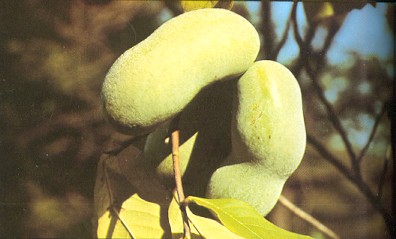 Common Name: Pawpaw, Paw Paw, Papaw, Poor Man's Banana, Hoosier Banana, etc. (In Australia the tropical papaya, Carica papaya, is also known as Pawpaw. See also: Papaya for illustrations & description. Origin: The pawpaw is native to the temperate woodlands of the eastern U.S. The American Indian is credited with spreading the pawpaw across the eastern U.S. to eastern Kansas and Texas, and from the Great Lakes almost to the Gulf. Fossils prove the pawpaw is indigenous to the U.S. Adaptation: The pawpaw is adapted to the humid continental climate of its native habitat. It is seldom found near the Atlantic or Gulf coasts. It requires a minimum of 400 hours of winter chill and at least 160 frost-free days. Pawpaws appear to be sensitive to low humidity's, dry winds and cool maritime summers. It has been successfully grown in parts of California and the Pacific Northwest that meet its growing requirements. It has grown well in the San Jose area (USDA Climate Zone 9 or Sunset Climate Zone 15). The climatic conditions of Southern California make growing the pawpaw there more difficult. The deep winter dormancy of the tree makes it highly frost tolerant, withstanding temperatures of -25° F or lower (hardy to USDA Climate Zone 5). Pawpaws can be grown as container specimens, although this is not often practiced. A deep pot is needed to accommodate the root system. DESCRIPTION Growth Habit: The pawpaw is a deciduous, often narrowly conical tree growing from about 12 feet to around 20 feet. Pawpaw trees are prone to producing root suckers a few feet from the trunk. When these are permitted to grow, the single-clone pawpaw patch comes into being. The prevailing experiences of many individuals is that the pawpaw is a slow grower, particularly when it is young. However, under optimal greenhouse conditions, including photo-period extension light of approximately 16 hours, top growth of up to 5 feet can be attained in three months. Foliage: The dark green, obovate-oblong, drooping leaves grow up to 12 inches long, giving the pawpaw an interesting tropical appearance. The leaves turn yellow and begin to fall in mid-autumn and leaf out again in late spring after the tree has bloomed. Flowers: Dormant, velvety, dark brown flower buds develop in the axils of the previous years' leaves. They produce maroon, upside-down flowers up to 2 inches across. The normal bloom period consists of about 6 weeks during March to May depending on variety, latitude and climatic conditions. The blossom consists of 2 whorls of 3 petals each, and the calyx has 3 sepals. Each flower contains several ovaries which explains why a single flower can produce multiple fruits. Fruit: The pawpaw is the largest edible fruit native to America. Individual fruits weigh 5 to 16 ounces and are 3 to 6 inches in length. The larger sizes will appear plump, similar to the mango. The fruit usually has 10 to 14 seeds in two rows. The brownish to blackish seeds are shaped like lima beans, with a length of 1/2 to 1-1/2 inches. Pawpaw fruits often occur as clusters of up to nine individual fruits. The ripe fruit is soft and thin skinned. CULTURE Location: The young plant is very sensitive to full sunlight and requires filtered sun for the first year or two. The use of tree shelters is an ideal solution to the problem, permitting the plant to receive a full day of filtered sunlight. Once established, pawpaws prefer full sun. The large dangling leaves dislike strong winds. Overall the tree is an excellent edible landscape addition. Soil: Pawpaws do best in deep, fertile soil that is moist, but well-drained and slightly acid (pH 5-7). The addition of compost to most western soils makes them more hospitable to the pawpaw. Avoid heavy, wet, alkaline soil. Irrigation: The pawpaw needs regular watering during the growing season. The soil should be kept moist but avoid water logging. Fertilization: The pawpaw responds to the application of an organic or granular fertilizer high in potassium twice a year. For container growing, 250 - 500 ppm of soluble 20-20-20 NPK plus soluble trace elements during growth phase is optimal. Pruning: Ordinarily little pruning is required, except to remove dead, damaged or wayward branches. Periodic pruning may be used to stimulate some new growth each year on older trees, since it is new growth that produces fruit the following season. Propagation: To break dormancy Pawpaw seed must receive a 90 to 120 day stratification, i.e. exposure to cold temperatures. To accomplish this, the seed should be placed in plastic freezer zipper bag containing a handful of moist sphagnum moss and refrigerated at 32° - 40° F. The over wintering of field planted seeds normally accomplishes this stratification requirement. Germination of pawpaw seed is hypogeal--the shoot emerges without any cotyledons. Under ideal greenhouse culture, germination can be expected in about seven weeks. Seeds field-planted in the fall will emerge the following July or August. But before the shoot emerges, the seed will have sent down a 10 inch long tap root. Hardwood cuttings are essentially impossible to root, while root cuttings have been variable to disappointing. Some success has been reported using softwood cuttings under intermittent mist with bottom heat (80° F) and supplemental light (14 hours). All grafting and budding techniques can be performed on the pawpaw, but T-budding is not recommended. Chip-budding has been reported to be successful. Scion wood should be gathered while the tree is dormant and kept refrigerated. Grafting can be done in the spring after vegetative growth begins. Young pawpaw plants have fleshy, brittle roots with few fine root hairs, making them difficult to t transplant. It is important to follow these helpful rules: 1.Use seedlings, not root suckers. 2.Move the tree with roots and soil intact. A container grown specimen is best. 3.Transplant the tree in the spring after bud break. 4.Give the plant good drainage and keep it well 
