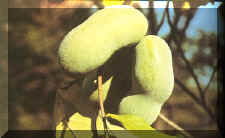 young, pawpaw foliage, but Pollination: Poor pollination has always plagued the pawpaw in nature, and the problem has followed them into domestication. Pawpaw flowers are perfect, in that they have both male and female reproduction parts, but they are not self-pollinating. The flowers are also protogynaus, i.e., the female stigma matures and is no longer receptive when the male pollen is shed. In addition pawpaws are self-incompatible, requiring cross pollination from another unrelated pawpaw tree. Bees show no interest in pawpaw flowers. The task of pollenization is left to unenthusiastic species of flies and beetles. A better solution for the home gardener is to hand pollinate, using a small, soft artist's brush to transfer pollen to the stigma. Pollen is ripe for gathering when the ball of anthers is brownish in color, loose and friable. Pollen grains should appear as small beige-colored particles on the brush hairs. The stigma is receptive when the tips of the pistils are green, glossy and sticky, and the anther ball is firm and greenish to light yellow in color. Harvest: Pawpaw fruit ripens during a four-week period between mid August and into October, depending on various factors. When ripe, it is soft and yields easily to a gentle squeeze, and has a pronounced perfumed fragrance. The skin of the green fruit usually lightens in color as it ripens and often develops blackish splotches which do not affect the flavor or edibility. The yellow flesh is custard like and highly nutritious. The best fruit has a complex, tropical flavor unlike any other temperate zone fruit. At present, the primary use of pawpaws is for fresh eating out of hand. The ripe fruit is very perishable with a shelf life of 2 or 3 days, but will keep up to 3 weeks if it is refrigerated at 40° - 45° F. Commercial potential: Although pawpaw fruit is not yet a commercially viable commodity, the domestication process is well underway. Several academic institutions are setting up seventeen Regional Variety Trial sites. Kentucky State University is the site of Pawpaw National Clonal Germ-plasm Repository. The pawpaw has also found its way to several overseas countries, and a few of these are actively engaged in research. Pawpaw leaves and twigs contain substances with promising anti-cancer and pesitcidal properties. Plant selection: A number of mail-order sources of pawpaw plants now offer both grafted cultivars and seedlings. Most seedling plants have been propagated from mixed seeds and will eventually end up producing undesirable fruit. Purchasers are advised to graft such plants to a known cultivar or order grafted plants initially. Container grown plants are much more likely to survive transplanting. FURTHER READING Callaway, M. Brett. Pawpaw (Asimina triloba): a "Tropical" Fruit for Temperate Climates. New Crops. 1993. Callaway, M. Brett. The Pawpaw (Asimina triloba). Kentucky State University, Frankfort, KY. 1990. Callaway, M. Brett and Dorothy J. Callaway. Our Native Pawpaw: The Next New Commercial Fruit? Arnold Arboretum, Harvard University. Fall 1992, pp 20-29. Layne, D. R. Pawpaws. In: Register of Fruit and Nut Varieties, 3d ed. A.S.H.S. Press, Alexandria, VA, 1996. Layne, D.R. The Pawpaw [Asimina triloba (L.) Dunal]: A New Fruit Crop for Kentucky and the United States. HortScience vol. 31, 1996, pp. 15-22. Peterson, R. Neal. Pawpaws in the Garden, and Pawpaws in the Nursery Trade. Pawpaw Foundation, 1990. Peterson, R. Neal. Pawpaw (Asimina). Acta Horticulture, ISHS. Feb.1991, pp. 569-600. Reich, Lee. Uncommon Fruits Worthy of Attention. Addison-Wesley, 1991. pp. 3-13. Kentucky State University Pawpaw Research Project. |