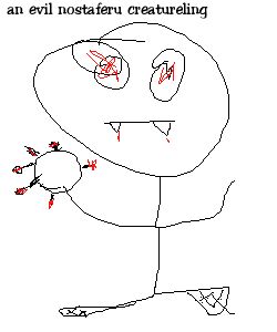 because they liked to discover space ships now. and they flew themselves to the planet nebulae (*cough* eat my filibrae!) and thereby attacked creatures such as Krishnas, Townspeople, Buttercup, Homos, Codfish, and Most About Everything Except Quails. because i like quails. :D .. but continuing! so the evil santa was NOT thereby attacked by "nostaferu" who were japanese and skull-headed and quite fliratious among the Crusaders.... o.o so santa kept poor poor poor alanna locked up for all eternity plus one in his evil cage of doom. O.O NO NOT THE EVIL CAGE OF DOOM.