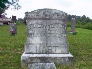 According to a family story told to Mary Hart, wife of Henry Hart who is the son of Jeff Hart, a grandson of Derrel J., he died due to a rattlesnake which did not bit him. She says that her father-in-law, Jeff Hart, told her that Derrel was in the woods near him homecutting firewood. During this time he came upon a rattlesnake which struck or jumped at him coming very close, and spit its venom into his face. When derrel did not arrive home at the expected time, his chidlren went looking for him and found him lying on the ground near the pile of wood. As they carried him home he told them of the snake and insisted that it did not bite him. An examination of his body revealed no evidence of snake bite. Nevertheless he became very sick and soon died, apparently from the poison of the venom spit into his face. He died October 9, 186 and is buried beside Rachel in the old part of the Mt. hermon Church Cemetery. He was only 58 years old.