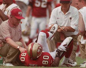 As Jerry continues on his astrological pace threw the record books. He still amazes fan after fan everyday. With his willpower and strength. Jerry continued his caos on deffinces untill the year of 1997. Jerry went down for the first time due to injury. He had not missed a football game becouse of injury sinse he was in high school.