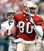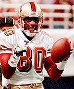 Heres my page dedecated to my favorite athelete of all time, Jerry Rice. In my opinion on the date of October 13, 1962 the best Wide Reciever of all time was born. And not many people will argue against that subject. By the time he retires, he will have every recieving record known to man. He has more touchdowns then any other player in the history of the NFL.