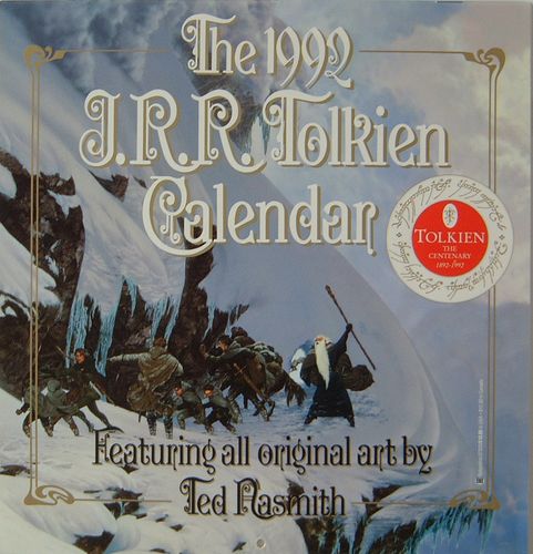 ISBN: 0-261-10227-3 "Tolkien The Centenary Calendar 1992". Centenary issue. Cover: “The Anger of the Mountain". Illustrations by Ted Nasmith. Dimensions: 13.5 x 15 inches (w x h); wire bound; heavy wire hanging loop; medium-weight paperboard mailer/envelope printed with “Tolkien The Centenary Calendar 1992”. The illustration of the mailer was printed in red ink. Rarity: 7 Often, the mailer is missing. |