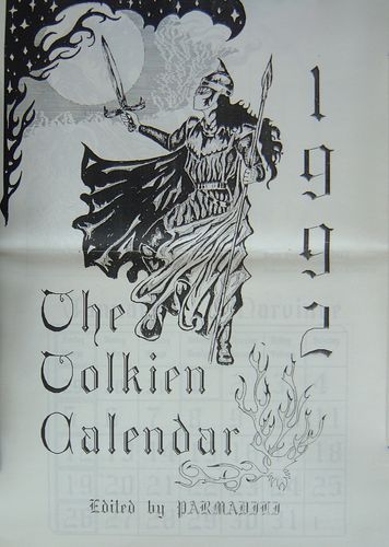 "The Tolkien Calendar 1992". Published by Seckja Tolkienowska, Poland (Polish Tolkien Society); edited by Parmadili (Andrzej Kowalski). Black and white illustrations by Malgorzata Pudlik and Aleksandra Kosciuszuk. Two versions exist: A3 size, A4 size; unbound. Rarity: 9 Based upon assumption that relatively few (less than 100? Need confirmation from the Polish TS) were created and their absence on eBay. I know of very few in the hands of collectors. |
