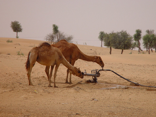 Some clever camels here, one turns on the tap as the other drinks