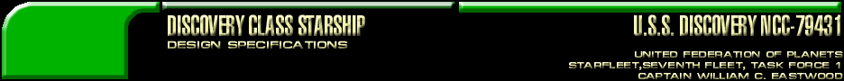 quadrants. With the occasional flare up of hostilities all along the Federations borders following the end of the Dominion War, Starfleet has had a need for vessels capable of detecting cloaked warships. While the newer, and some refit Sovereign class carry sensors capable of detecting some of latest designs of cloaked vessels, the newest DISCAL sensor suite on the Discovery class is capable of detecting cloaked vessels at greater ranges. As a result, the Discovery class has been cleared for service as a Counter-Cloak cruiser if necessity requires it. This should make the class an asset to local commanders on a tactical level for Neutral Zone defense. Hearkening back to the days of Anti submarine warfare, the Discovery class will prove to be useful in a combat role if required. SYSTEM DETAILS FSS-44M Multi-phasic Regenerative Shielding System: Developed by Sylvanesti Shields Systems, Sylvanesti has taken multi-phasic shielding and created a system that allows for a double layer of shielding with separate inner and outer layers. Although both layers can be raised and lowered individually, the inner layer can be manipulated for either general coverage, or more concentrated coverage of key areas of the starship's hull. Should one layer fail, the other can still be active, considering that both layers are independent of each other. The multi-phasic shield arcs can also be moved, allowing for reinforcement of weakened shield arcs. As indicated, the FSS-44M Shield system besides having two independent layers incorporates regenerative technology as pioneered on the Sovereign class starship. Auto modulating, the shield can change frequency to better counter incoming weapons fire. It is hoped this new shield system is to be the next generation of shield for Starfleet. MAN 210 Mk 1 Quantum Slipstream Drive: Quantum slipstream technology is one of the most advanced propulsion systems ever encountered by Starfleet. The quantum slipstream is an extremely powerful means of propulsion that can transport a vessel at speeds in the upper warp 9.9 range. The velocities involved are so great that, in theory, the slipstream could carry a ship across the galaxy in a single day, even thought this range is still beyond the abilities of Federation science. The quantum slipstream is actually a narrowly focused, directed warp field that is initiated by manipulating the fabric of the space-time continuum at the quantum level. It works by focusing a quantum field through a deflector dish to generate massive changes in local space curvature; this creates a subspace tunnel, which is projected in front of the vessel. Once a ship has entered this tunnel, the forces inside propel it at incredible speed. The slipstream is large enough to accommodate more than one vessel, so a ship without a quantum drive can enter the slipstream and accompany the vehicle that is generating it. In order for a non slipstream drive equipped ship to navigate safely, it's navigation controls must be slaved to the ship operating the slipstream. In order to initiate a controlled shutdown of a quantum drive, the field strength has to be reduced by 50 percent. This can be done by reversing the drive's polarity. From its discovery, the crew of the USS Voyager discovered that the greatest difficulties involved with quantum slipstream technology lie not in generating the slipstream but in maintaining and navigating it. Even a slight phase variance can cause the slipstream to collapse, with disastrous consequences for any ship inside it. In order to compensate for the massive computer strain inherent in maintaining a slipstream, vessels of the Discovery class have dedicated navigational computer core. In order to maintain the slipstream, a ship has to constantly modify the quantum field with its deflector dish. The limitation of all the drives is that they can not be activated and used without a minimum range of travel of not under 50 light years distance. Although still dangerous, Starfleet Engineers have managed to incorporate current advancements in navigation techniques with enhanced computer helm control systems and vastly improved structural integrity field technologies to allow medium to lower end use of the Quantum Slipstream drive units. Should