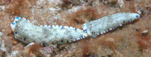 Pair of Dermatobranchus sp (? Spot-Edged Dermatobranchus) crawling across the red algae of the wasteland