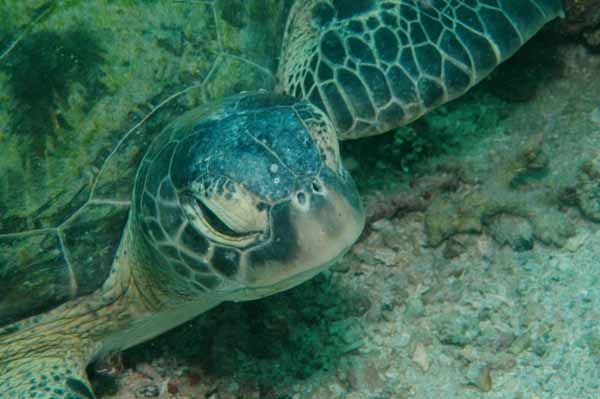 Came across two medium sized green turtles Chelonia mydas resting on the bottom. Of course with a macro lens there is not much to focus on except the head.