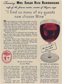 Florence Burroughs featured in a magazine wine ad Click for enlargement On February 15, 1936 Ed paid a special tribute to his bride. Swords of Mars, which he had written back in late 1933, was published by ERB Inc. The encrypted acrostic formed from the first letters of each chapter were now visible for the world to see: "To Florence with all My Love Ed." May of that year saw them return to Los Angeles to stay in a succession of residences: 2315 North Vermont Avenue, the Hearst-owned Chateau Elysee at 5930 Franklin Avenue and Sunset Plaza apartments (June 1937) at 1220 Sunset Plaza Drive, a luxury bungalow complex at the opposite side of Columbia Studios, Hollywood. They then lived at 716N Rexford in Beverly Hills until 1940 when they moved to Hawaii.