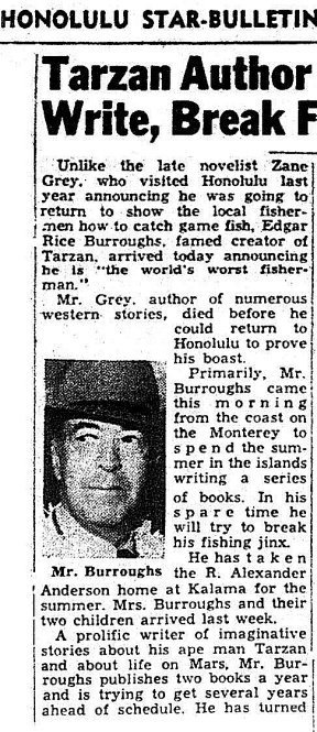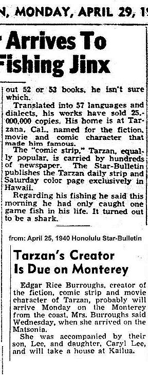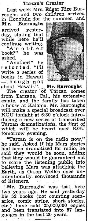 An April 28, 1940 notice for KGU Radio in Honolulu, from the Sunday Honolulu Advertiser.ERB arived in town the day before he was scheduled to make a radio address promoting the Tarzan radio serial. Unfortunately no recording of this address seems to have been made.
