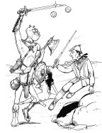 The green behemoth charged me, and my first leap to avoid his attack sent me a man's height into the thin Martian air. This six-limbed chimera was armed with a double-handed battle-axe and a long heavy sword. Using my knowledge of single-stick and fencing and my somewhat rusty experience as a cricket-player, I wound up and pitched a stone against the wicket of his unprotected head and then prepared my walking stick in a defensive posture.