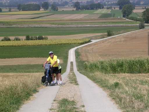 language of facial expressions and hand gestures. We understood what he was saying despite the language barrier. He seemed to be whispering: "Yes, yes you can take this path, but go quietly so the old lady doesn't hear you sneaking through the farm!" We thanked him with a big handshake and we headed off down a dirt path that got narrower until it became only a footpath through high grasses before reuniting with the cycle path. |