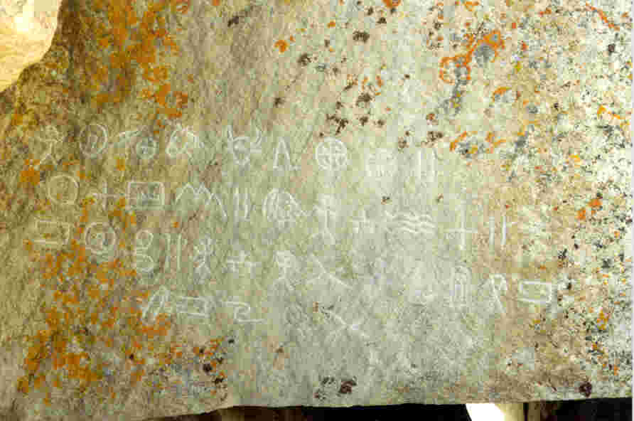 The glyphs above were left some 800 years ago. Most of these glyphs depict the surroundings in that area. However, others have a more spiritual side to them. The long U shaped glyph represents the sun on it's path through their calendar year. Each notch is one day. Some of the symbols could be their tribes
