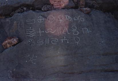 religious beliefs. The bar shaped glyphs seem to represent a journey of some sort. Each dot would signify their position at different times along the trek. Even though these were left by the Ansazi Indians, probably not the Aztecs, it shows that this area was used as a northern route for many groups, most likely