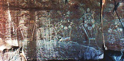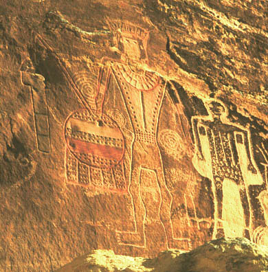 Some of the finest rock art in the world is located in the Dry Fork Canyon and Ashley Creek of Utah. This particular glyph, (above)located in Dry Fork Canyon, is called,"The Aztec," by many locals. The lower picture is just an extension of the same panel. These glyphs have a definate Aztec look to them!