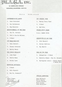 Johnny Murphy's Country Music Column Winnipeg Free Press, Saturday, March 22, 1980 The Manitoba Annual Country Awards acquired a new impact with this fourth edition moving into more ceremonial surroundings and attracting the elite of this province's performers and those associated with country music in Manitoba. Entertainer(s) of the year was the outstanding husband-and-wife duo, Bill and Sue-On Hillman. The winners are determined by a committee of judges comprised of individuals active in all phases of country music and related businesses. Top male vocalist award was presented to Harvey Henry, top female vocalist was won by Rhonda Hart. For the second year in a row the recording artist award went to Ray St. Germaine. Repeat winners for the third year as most popular country band was Red Wine. The Country Tigers were named top country band. Instrumentalist recognition went to Ron Halldorson, while Smokey Ferlin was saluted with the Golden Music Award. Tony Sianchuk, founder of the MACA, was recognized for his outstanding contributions to country music in Manitoba. |