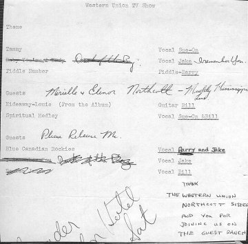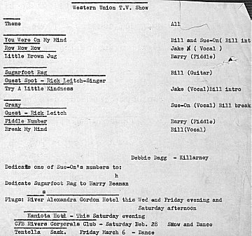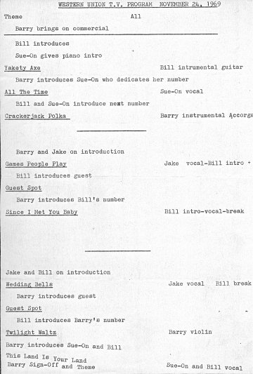 Late '60s You Were On My Mind Bill and Sue-On (Bill Intro) Row Row Row Jake (Vocal) Little Brown Jug Barry (Fiddle) Sugarfoot Rag Bill (Guitar) Guest Spot - Rick Leitch - Singer Try A Little Kindness Jake (Vocal) Bill Intro Crazy Sue-On (Vocal) Bill Break Guest - Rick Leitch Fiddle Number Barry (Fiddle) Break My Mind Bill (Vocal) Dedicate one of Sue-On's numbers to Debbie Dagg